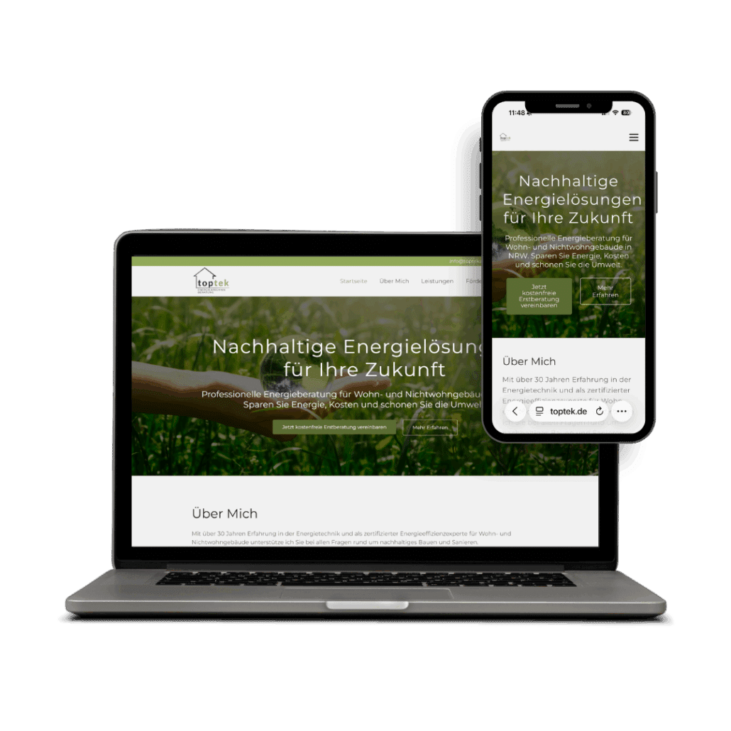 Für Toptek habe ich eine Website gestaltet, die die Energieberatungsleistungen des Unternehmens in den Mittelpunkt stellt. Der Aufbau ist klar strukturiert, leicht verständlich und vermittelt sofort Vertrauen. So finden Kunden schnell die passenden Infos rund um effizientes und nachhaltiges Energiesparen.